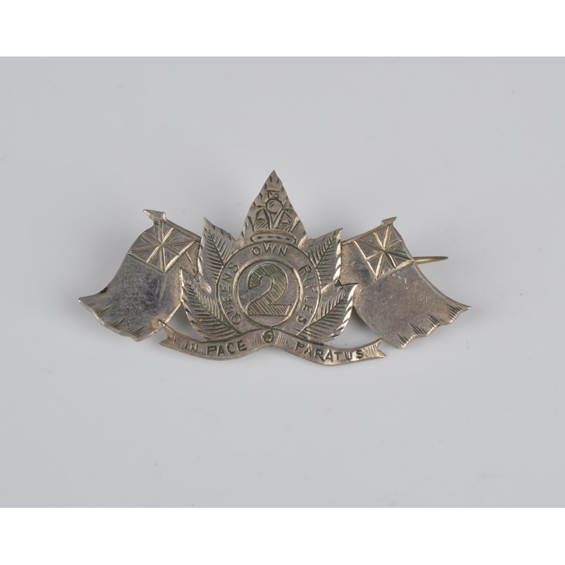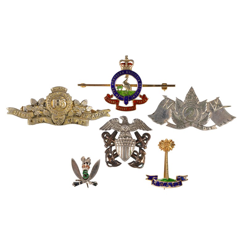 Six Commonwealth and Foreign sweetheart brooches: Royal West African Frontier Force, nine carat gold and enamel, Garrard and Co. Ltd., Birmingham 1957; Northern Rhodesia Regiment, enamelled and stamped '9CT'; United States Navy, marked 'STERLING'; 5th Gurkha Rifles, white metal and enamel; Queen's Own Rifles of Canada, white metal; 185th Canadian Infantry Battalion (Cape Breton Highlanders), base metal. [6]