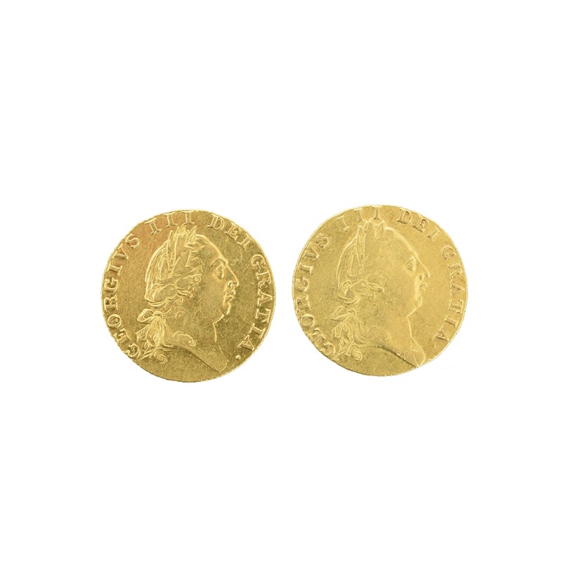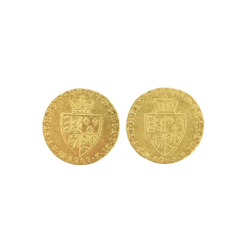 George III, gold guineas (2), 1787 and 1788, fifth head, rev. spade-shaped shield (S 3729), very fine and good fine. [2]