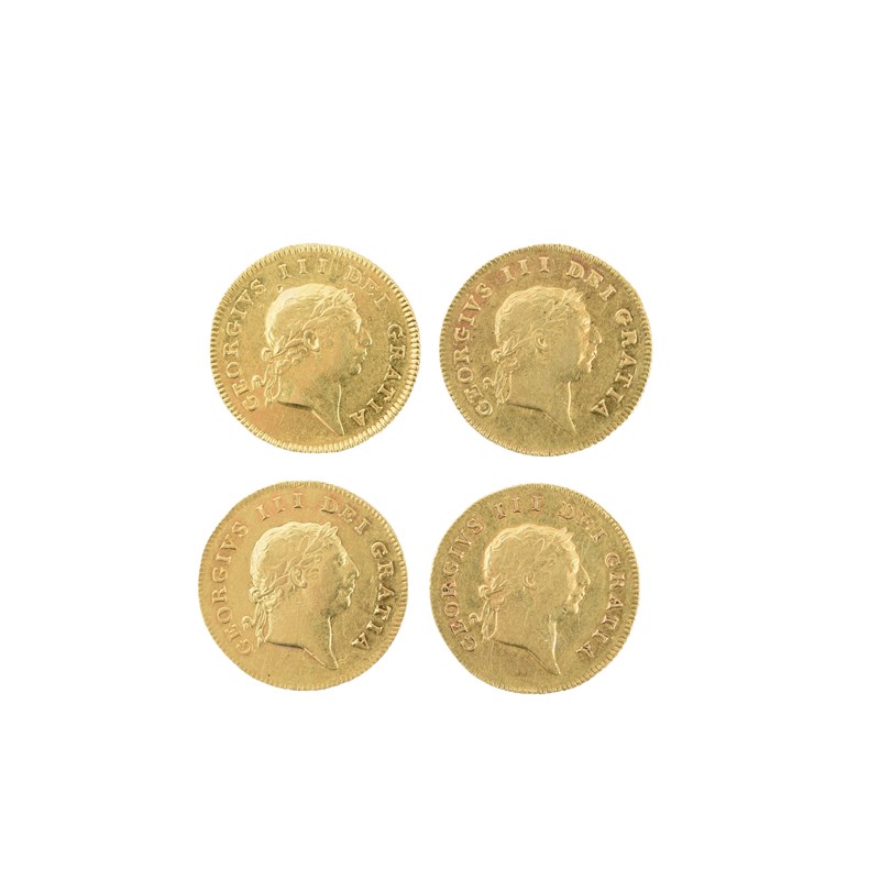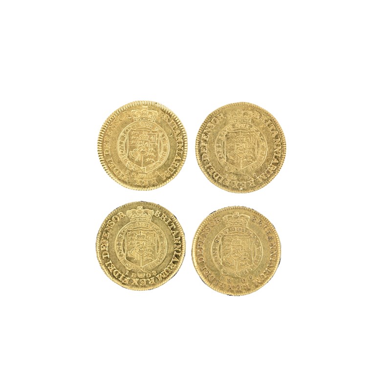 George III, gold half guineas (4), 1804, 1806, 1808 and 1809, seventh head, rev. shield in garter (S 3737), the first two very fine or better, the others very fine or nearly so. [4]
