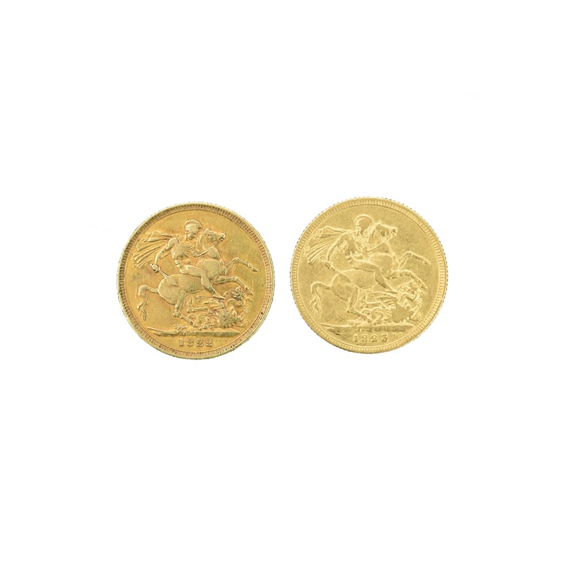 George III, gold sovereigns (2), 1822 and 1823, laureate head, rev. St George (S 3800), very fine and nearly so. [2]