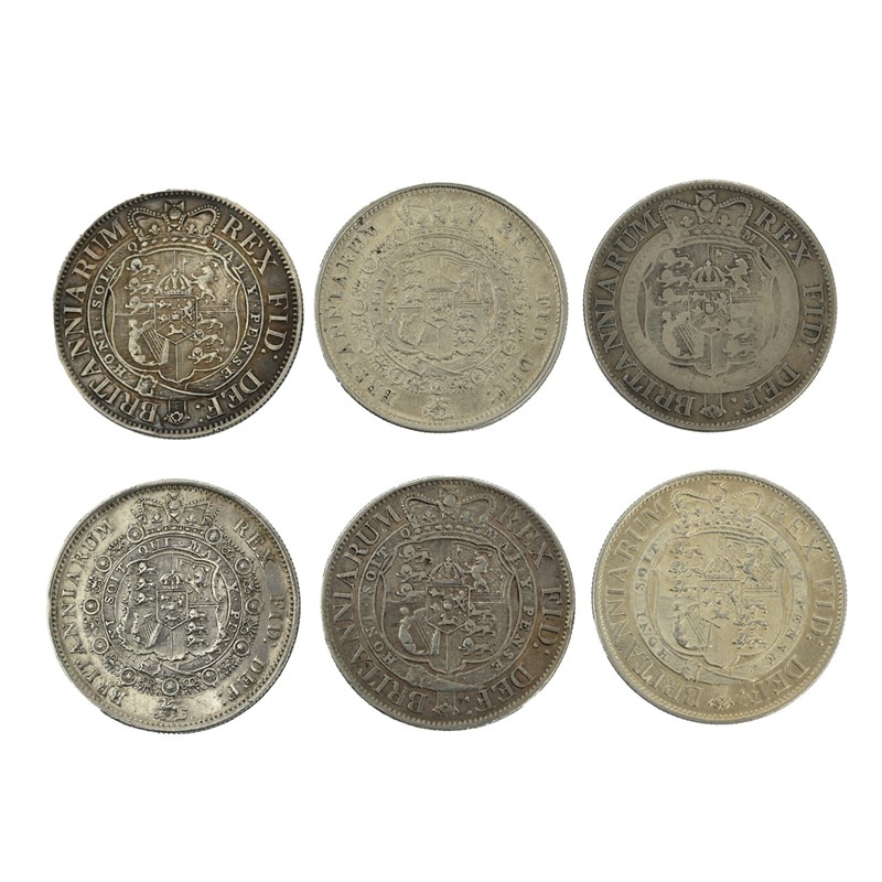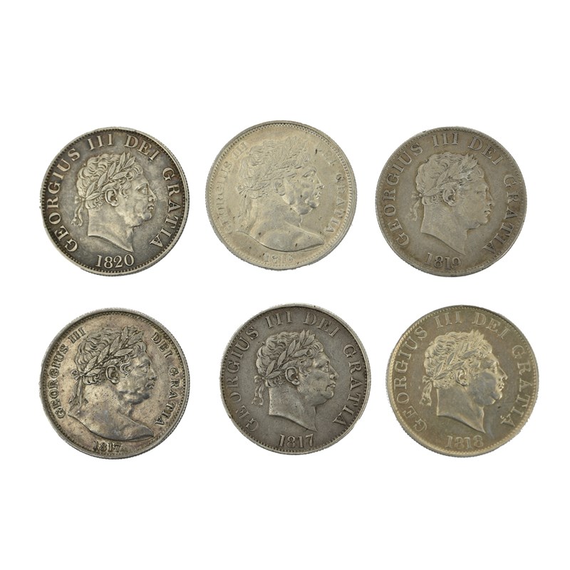 George III, silver halfcrowns (6), 1816 and 1817, large 'bull' head (S 3788), good very fine and very fine; 1817, 1818, 1819 and 1820, smaller head (S 3789), good fine, very fine, fine and good very fine with some toning. [6]