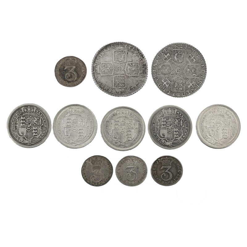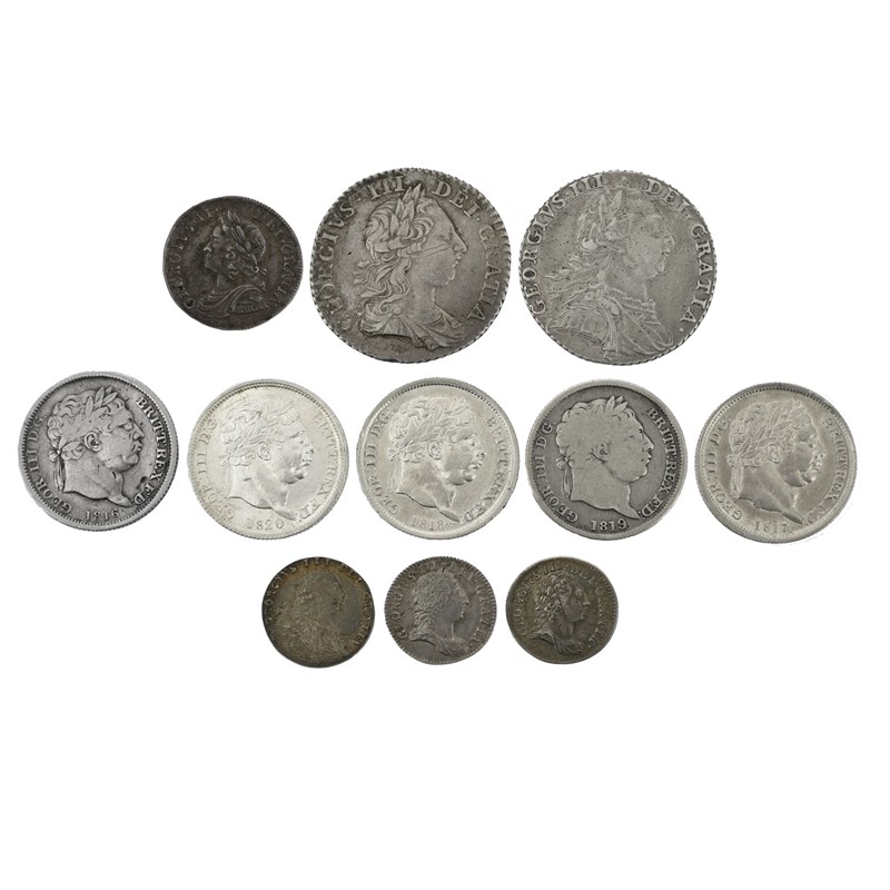 A quantity of Hanoverian silver coins, comprising: George II, threepence, 1746 (S 3713B), good very fine and toned; George III, shilling, 1763, 'Northumberland' type (S 3742), some edge damage, fine or a little better; shilling, 1787, old bust, no semée of hearts (S 3743), good fine; shillings (5), 1816, 1817, 1818, 1819 and 1820, new coinage (S 3790), good fine, good very fine, very fine, near fine and about extremely fine; threepences (2), 1762 and 1763, young bust (S 3753), very fine; and threepence, 1795, older bust (S 3755), near very fine, reverse better. [11]