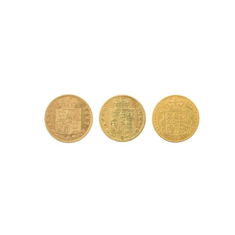 George IV, gold half sovereigns (3), 1823 and 1824, laureate head, rev. plain shield (S 3803), very fine and good fine; 1828, bare head, rev. garnished shield (S 3804), fine. [3]