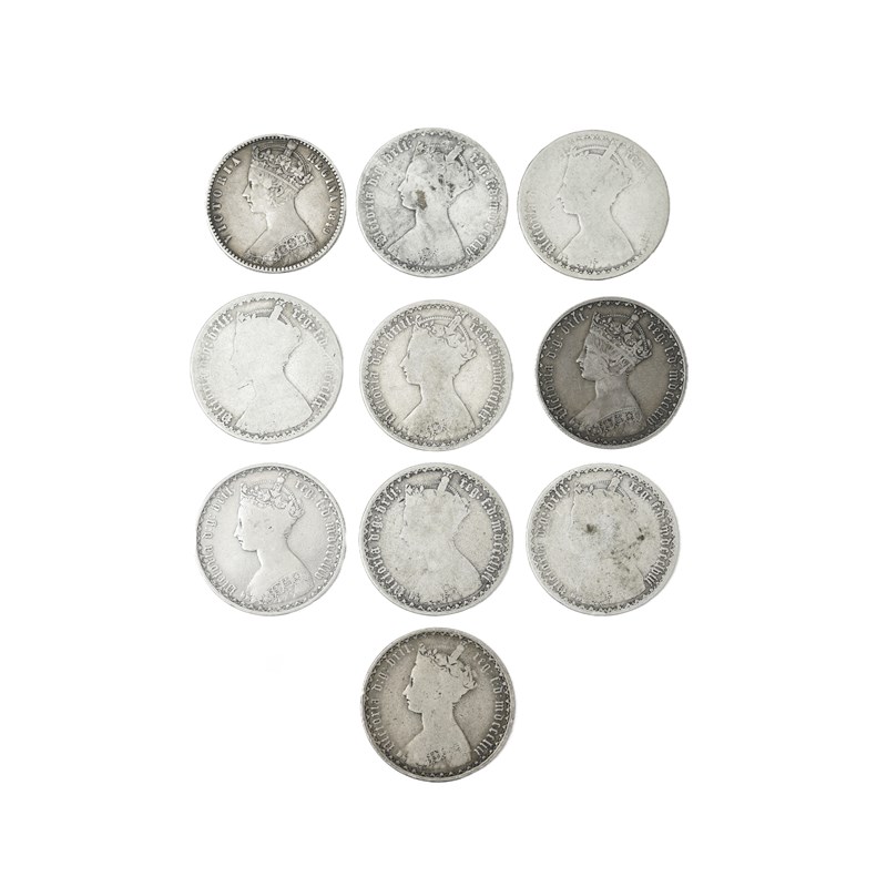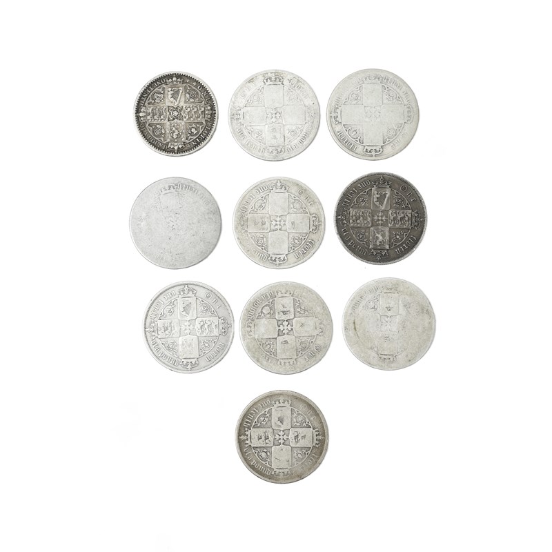 Victoria, silver florin, 1849, 'godless' type (S 3890), very fine or nearly so; together with silver florins (9), 'gothic' type, various dates, most fair, one fine. [10]
