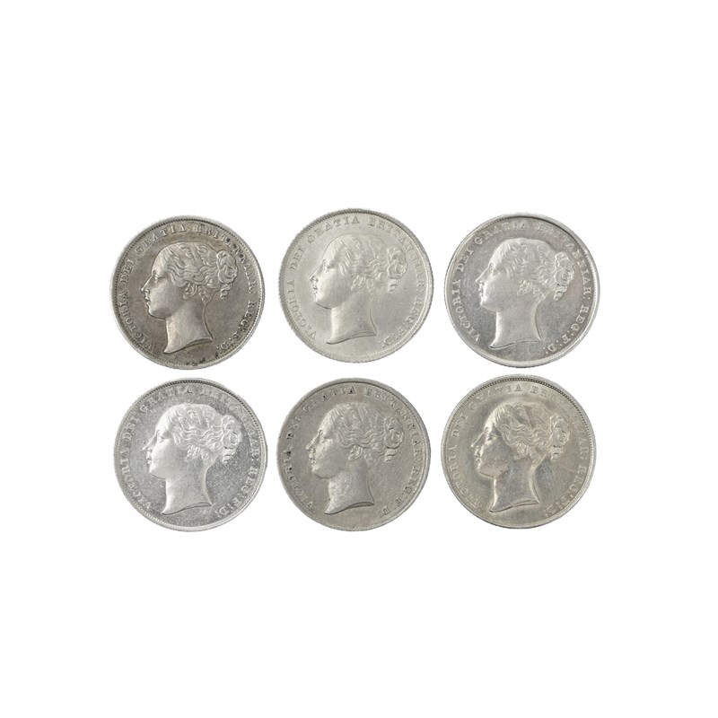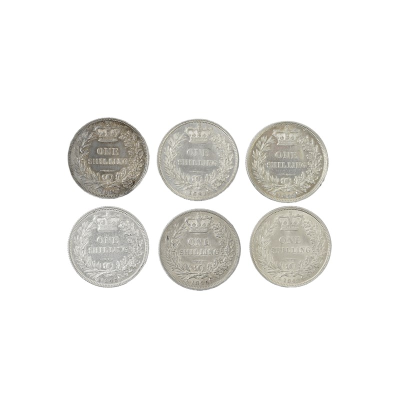 Victoria, silver shillings (6), 1840--1843, 1845 and 1849, young head, no initials on truncation (S 3904), good very fine, reverses generally better, the last with die crack and reverse extremely fine. [6]