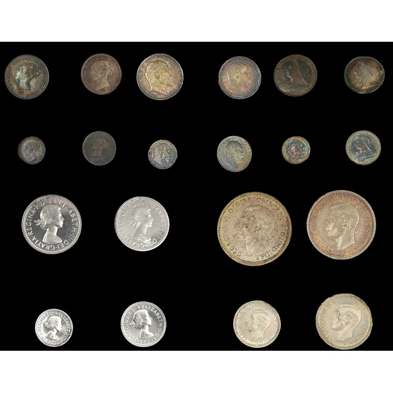 Maundy silver coin sets (5): Victoria, 1884, young head (S 3916), nearly extremely fine; 1893, veiled bust (S 3943), extremely fine and toned; Edward VII, 1903 (S 3985), about extremely fine and toned; George VI, 1942 (S 4086), extremely fine; Elizabeth II, 1974 (S 4211), mottled toning, otherwise extremely fine; each set in a later fitted case. [25]