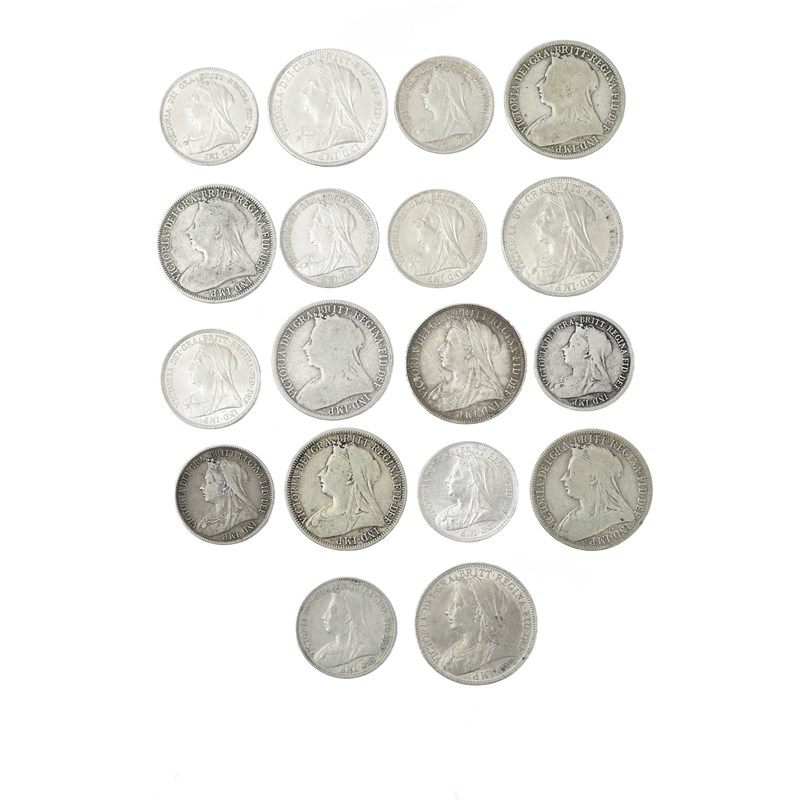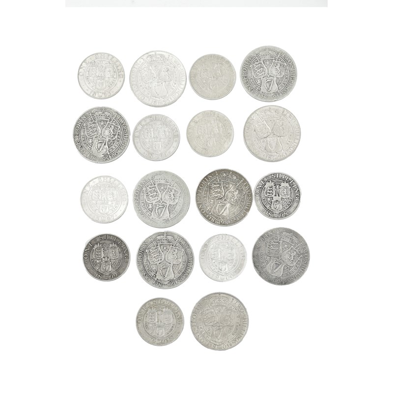 Victoria, silver florins (9), 1893, 1896, 1898 and 1901, veiled bust (S 3939), extremely fine or nearly so; five others, various dates, about fine; shillings (9), 1893, 1895-1897, 1900, veiled bust (S 3940), extremely fine or nearly so; and four others, various dates, fine to very fine. [18]