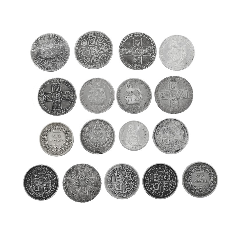 A small quantity of Hanoverian small denomination silver coins, including: George II, sixpences (5), 1741 (S 3708), fair; 1746, LIMA (S 3710), very fine; 1758 (S 3711), very fine; and two others; George III, sixpences (5), five various; and similar coins of George IV and William IV. [17]
