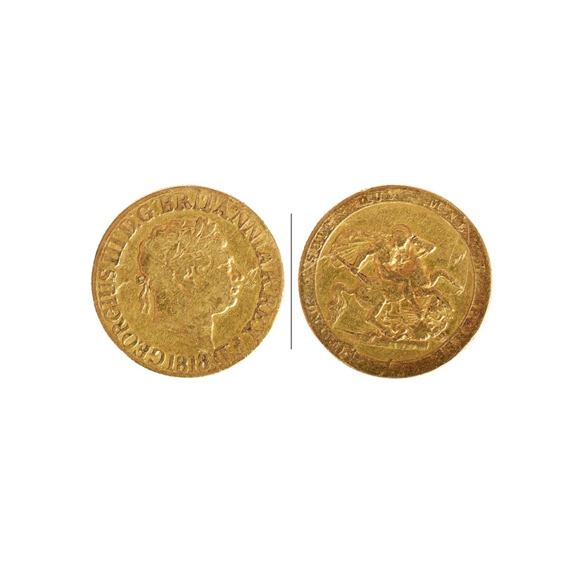 George III, gold sovereign, 1818, descending colon after BRITANNIAR (S 3785, F 371), about fine.