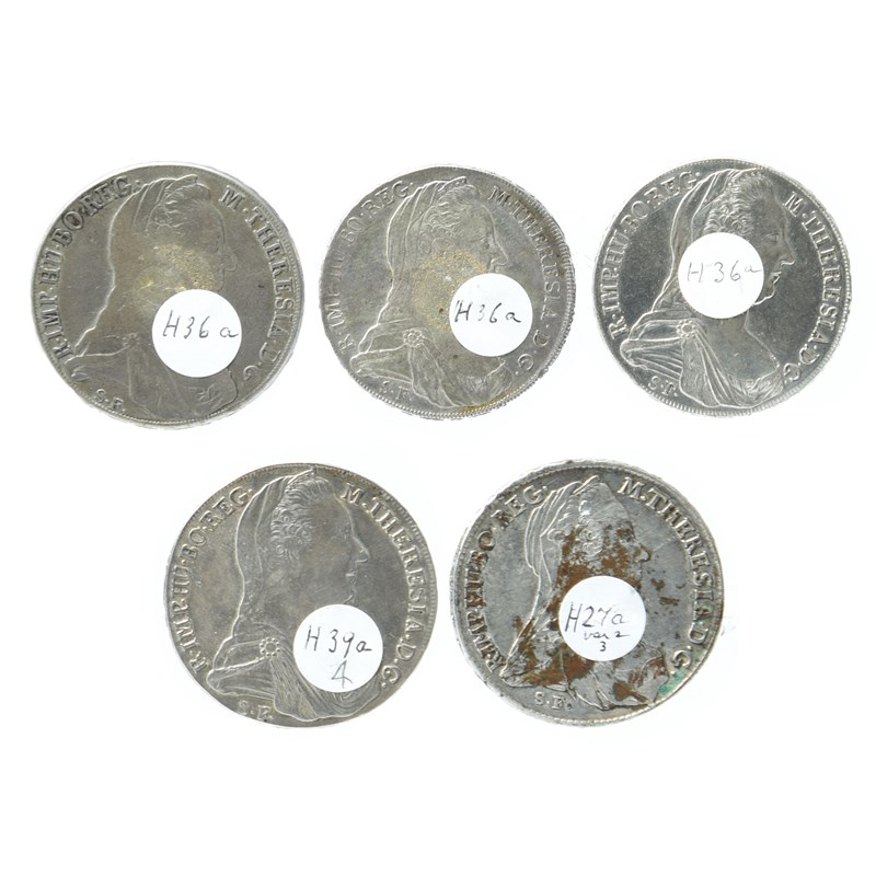 Austria: Maria Theresa, silver thalers (5), 1780 SF, restrikes: Milan, struck c. 1815-28 (3) and c. 1821-41 (Hafner 36a and 39a), fine, fine, good very fine and near very fine; and Günsburg, struck c. 1781-88 (Hafner 27 or variant), surface with dark residue, near very fine. [5]