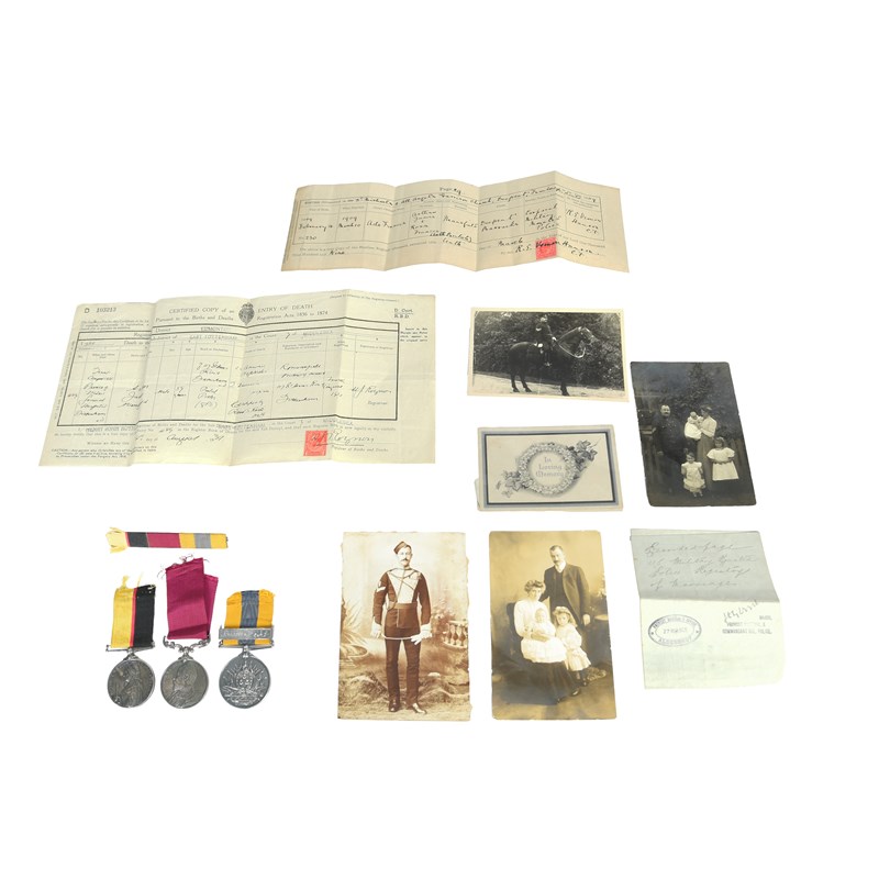 Arthur James Mansfield was born at Chatham in Kent in 1871 and baptised at the Royal Dockyard Church in November of that year. He grew up in Sheerness, and upon leaving school became a dockyard Labourer. Having moved to London, he attested for the 21st Hussars at Woolwich on the 2nd of November 1892. Mansfield served with the regiment in India between August 1893 and October 1896, when the Hussars were posted to Egypt, having been promoted to Lance-Corporal in January 1896. In May 1897 his Regiment was converted to Lancers, and they were the only British cavalry regiment to serve in Major-General H. H. Kitchener's conquest of the Sudan. At the Battle of Omdurman, 2nd September 1897, the 21st Lancers became famous for charging a hugely superior force of the enemy, losing seventy out of 400 men killed or wounded, and winning three Victoria Crosses. Mansfield is confirmed as having charged with C Squadron. He saw further service in the UK, Egypt and Ireland, and was awarded the Long Service and Good Conduct Medal in 1911. Arthur Mansfield died in Tottenham in August 1931, leaving his wife Rosa and three children. Offered with research.