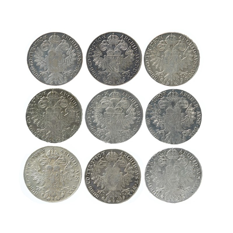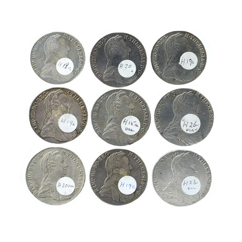 Austria: Maria Theresa, silver thalers (9), 1780 SF, restrikes, Vienna, struck c. 1790-95 (Hafner 15a), edge damage 5 o'clock, otherwise at least very fine; c. 1795-1803 (4) (Hafner 19a), near very fine; c. 1795-1803 (2), rev. AVST.DVX (Hafner 20 and variant), good very fine or better and near very fine; c. 1781-88 (2) (Hafner 26 or variant), edge bruising, about very fine. [9]
