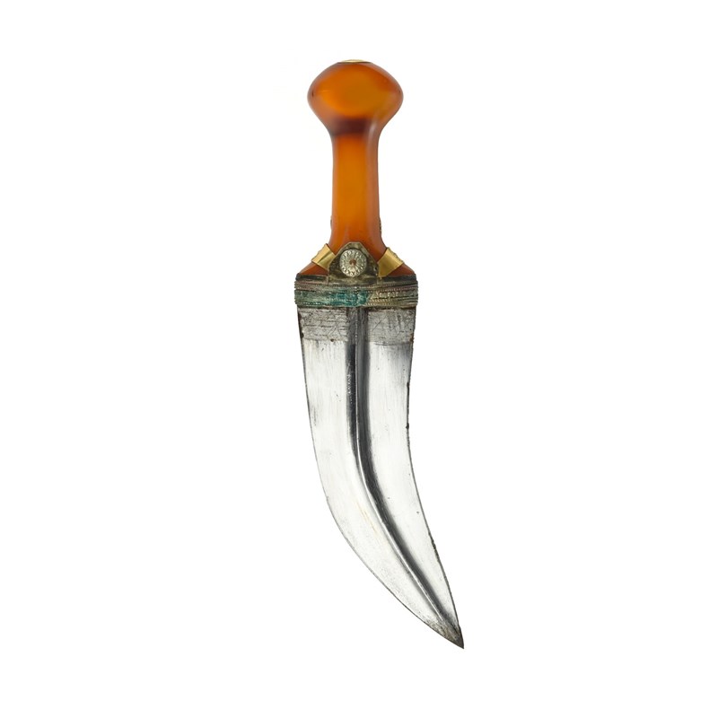 A Yemeni dagger (jambiya), broad curved blade 7 in. with medial ridge, hilt of faux amber set with