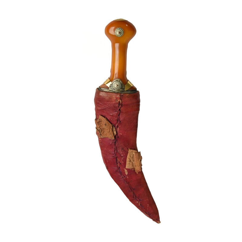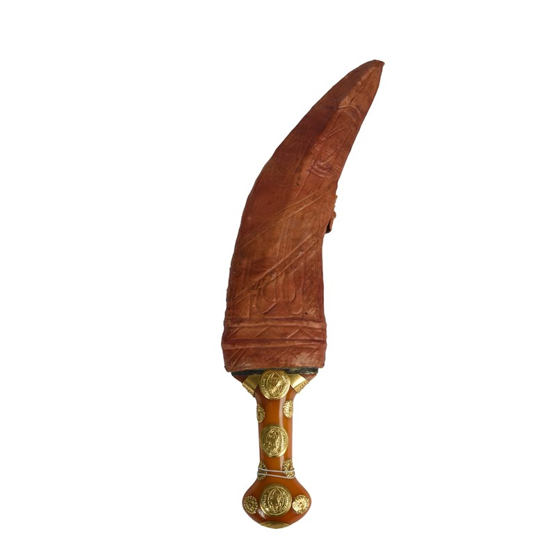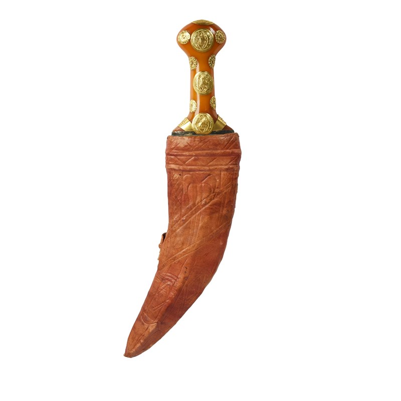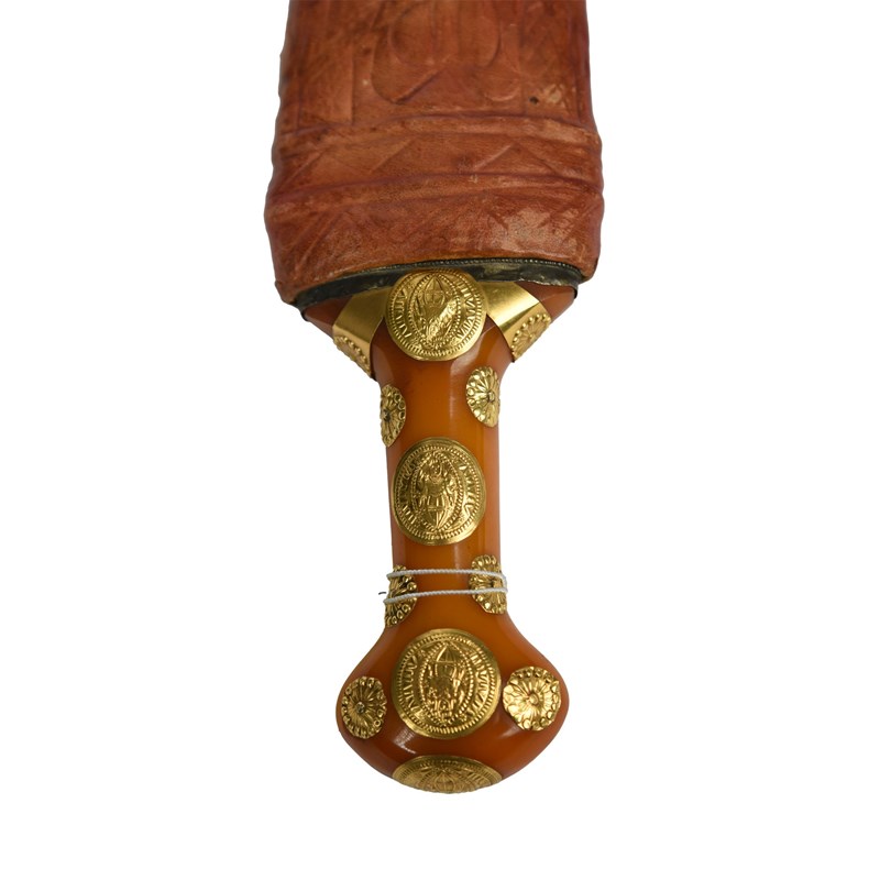 A Yemeni dagger (jambiya), broad curved blade 7 in. with medial ridge, hilt of faux amber set with gold ornaments including discs representing Byzantine coins, leather scabbard with tooled decoration.