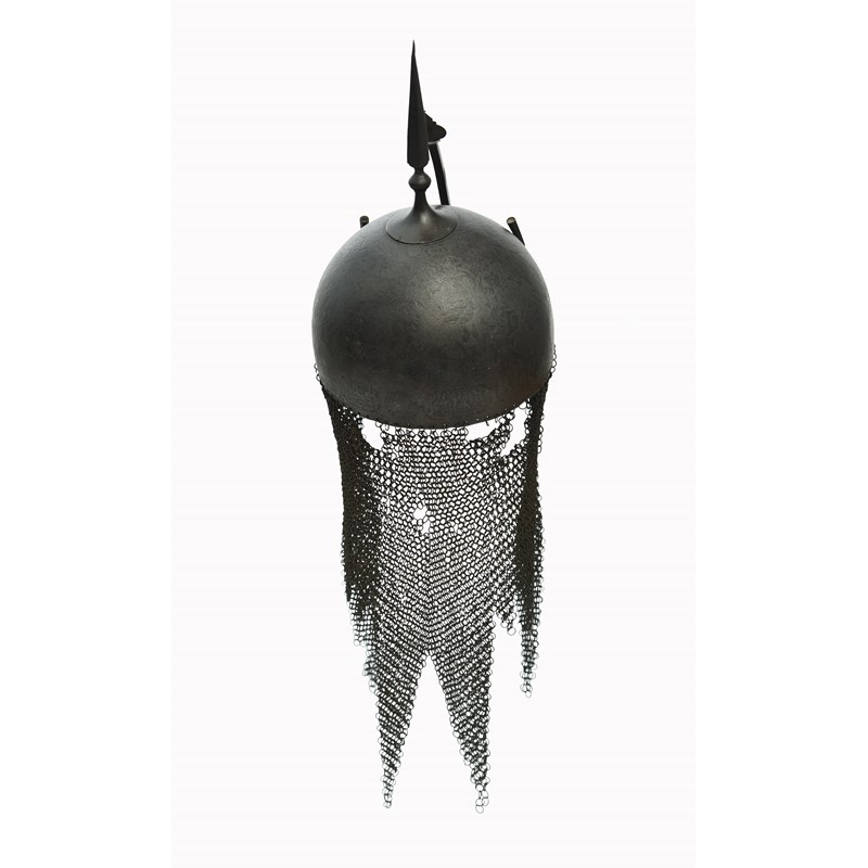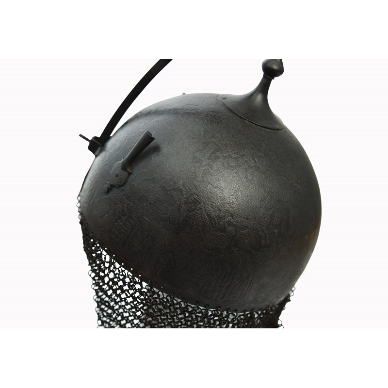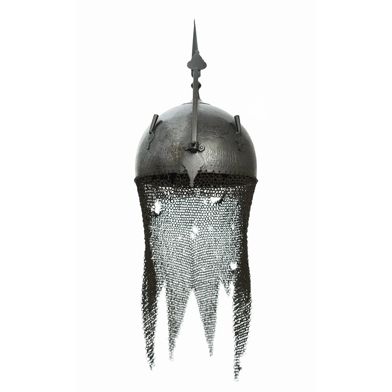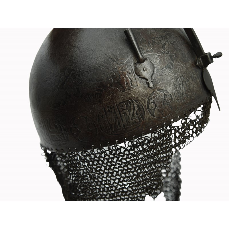 A Persian helmet (khula-khud), steel bowl with nasal bar secured by a screw, twin plume holders, square-section top spike on a baluster stem rising from a round foot, the surface of the bowl decorated all over in low relief with hunting scenes above a frieze of alternating portrait vignettes and panels of text, a mail skirt suspended from the rim.