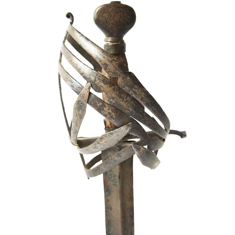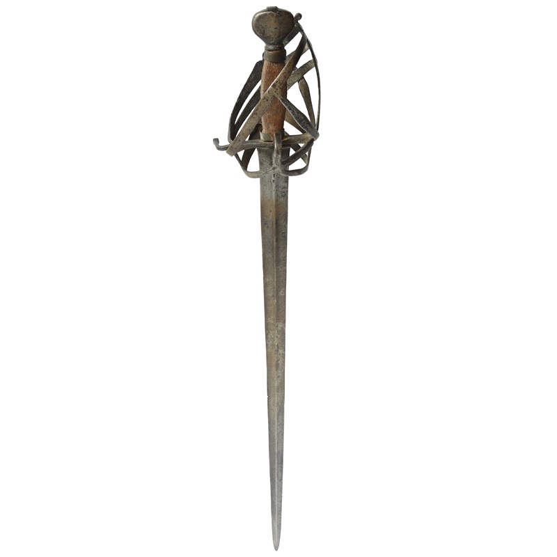 A Venetian basket-hilted sword (schiavona), double-edged blade 35 in. with low medial ridge,