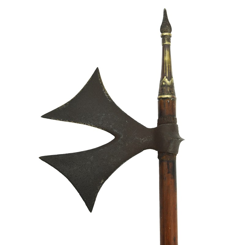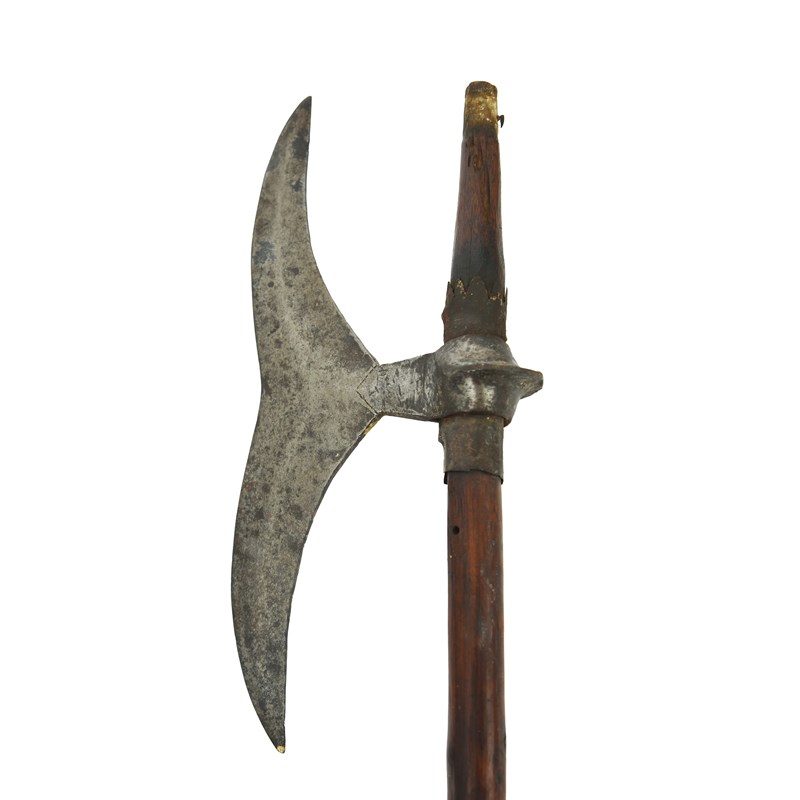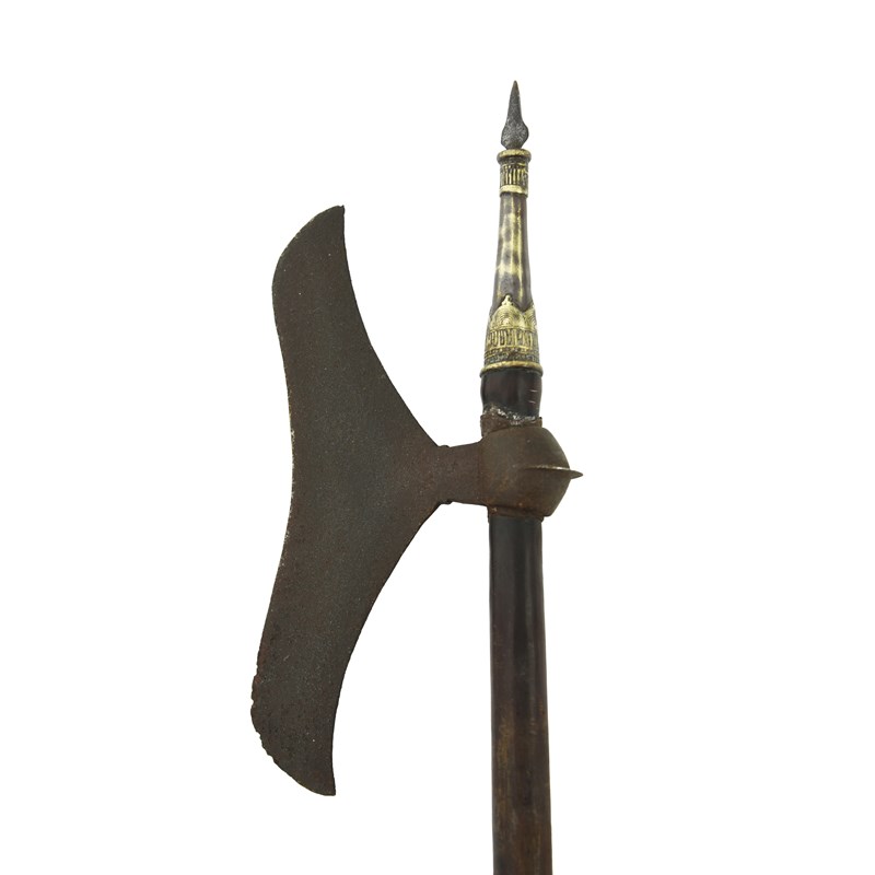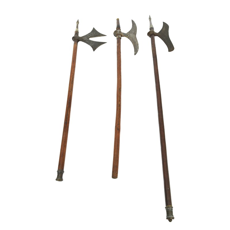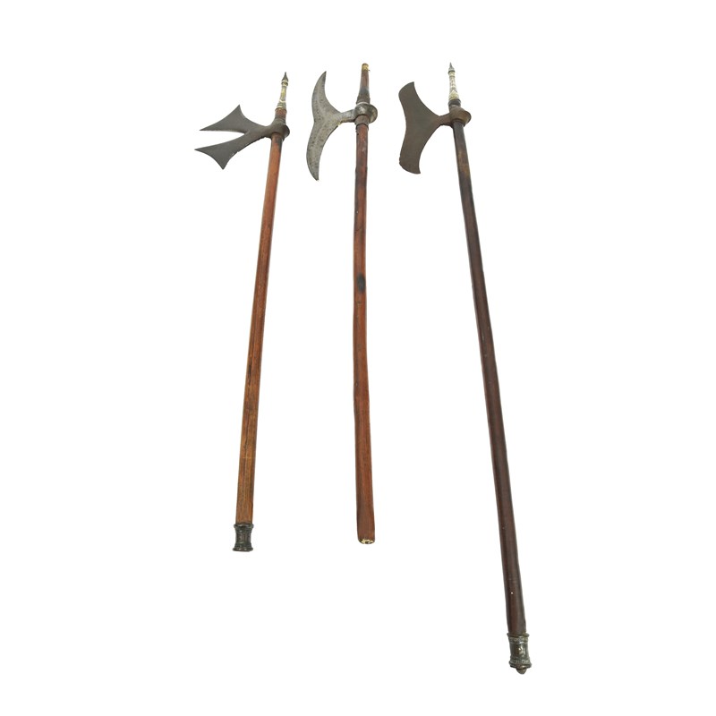Three Indian axes (bulova), the first with angular bifurcated blade, brass and iron top spike and a brass collar to the foot of the slender shaft; the next similar but with a long blade with a re-curved edge; the last with blade of similar form to the second but mounted on a plain shaft. [3]