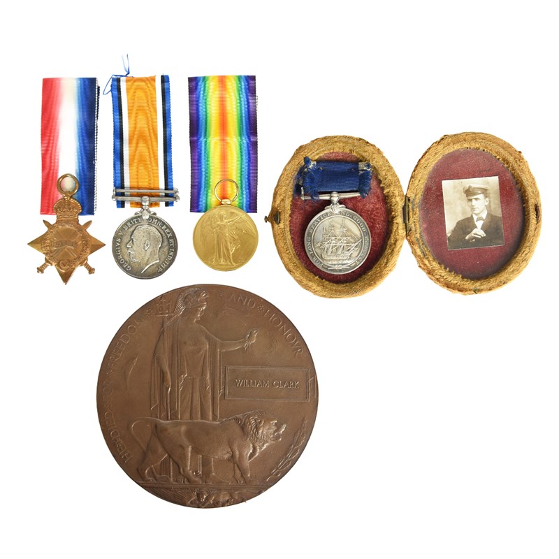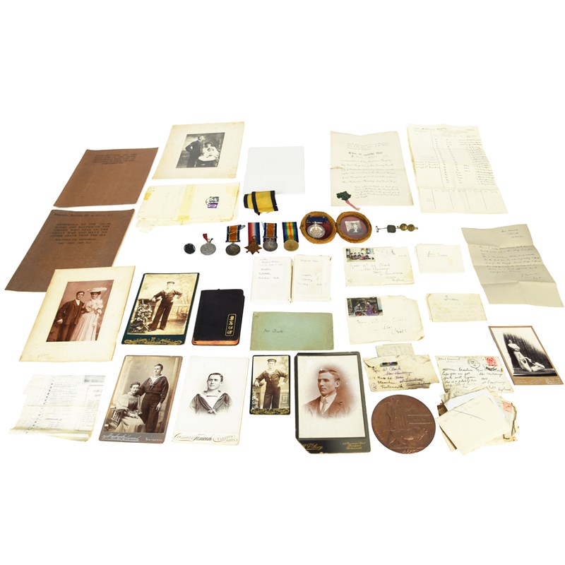 The H.M.S. Hampshire Casualty group of four medals and the associated Memorial Plaque to Master at Arms William Clark, Royal Navy: 1914-15 Star (180547, W. CLARK. M.A.A., R.N.); British War Medal and Victory Medal (180547 W. CLARK. M.A.A., R.N.); Royal Navy Long Service and Good Conduct Medal, Edward VII (180547 WILLIAM CLARK, SH. CORPL. 1CL., H.M.S. ROYAL ARTHUR.); the first three in their original packaging, about as struck; the fourth in fixed in an oval case with a photograph of the recipient, extremely fine and toned; the Memorial Plaque issued in commemoration of this man (WILLIAM CLARK), in its card holder with commiseration slip; together with an archive of original documents, including: a copy of the recipient's certificate of service, several portrait photographs, a very poignant collection of letters written by this man to his infant daughter Wilhelmina 'Queenie' from H.M.S. Hampshire during the final two years of his life, another letter to his wife Rose and one to him from Queenie, and other items; also a British War Medal 1914-20 (19793 PTE. A. S. STOKES. SOM. L. I.), extremely fine.