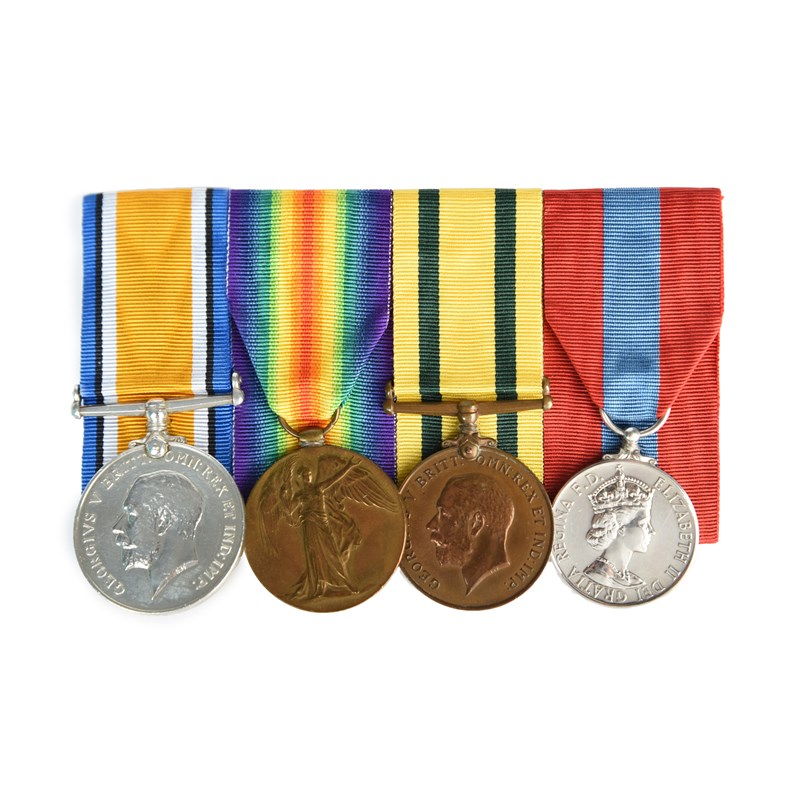 Three medals to Private William Ward, West Riding Regiment and Royal Artillery: British War Medal 1914-20 and Victory Medal (608370 PTE. W. WARD. W. RID. R.), Territorial Force War Medal (1132 GNR. W. WARD. R.A.), together with the Silver War Badge issued to this man, numbered 470509; the medals later mounted with an associated Imperial Service Medal, Elizabeth II (JOHN WILLIAM WARD), and accompanied by the box of issue for this medal; medals good very fine and better, SWB with soldered repair to pin fitting obscuring the first numeral of the serial number.