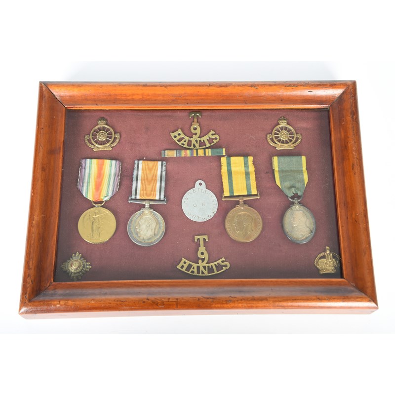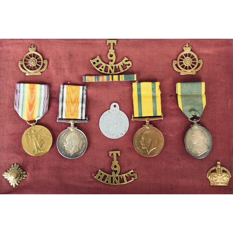 A Siberian Intervention group of four medals to Sergeant George Robert Lillington, Hampshire Regiment: British War Medal 1914-20 and Victory Medal (355102 SJT. G. R. LILLINGTON. HAMPS. R.); Territorial Force War Medal (208 PTE. G. R. LILLINGTON. HAMPS. R.); Territorial Force Efficiency Medal, George V (355102 SJT G. R. LILLINGTON. 9/HAMPS: R.), extremely fine or better, the silver medals toned, [4]; framed with a small quantity of 9th Battalion Hampshire Regiment insignia.
