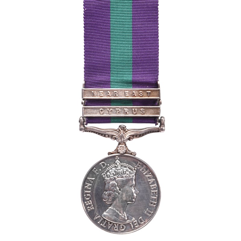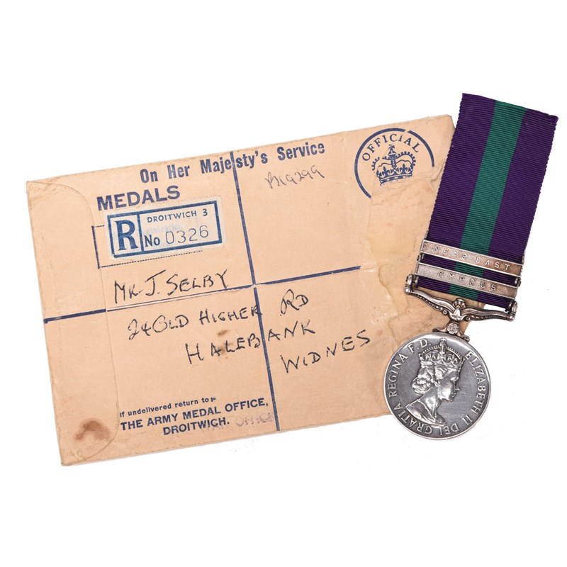 A highly desirable Suez Crisis El Gamil airborne operations General Service Medal 1918-62 to Private Joseph Charles Selby, 3rd Battalion Parachute Regiment, Elizabeth II, 2 clasps: Cyprus, Near East (23197514 PTE. J. SELBY. PARA.), nearly extremely fine; with envelope of issue.