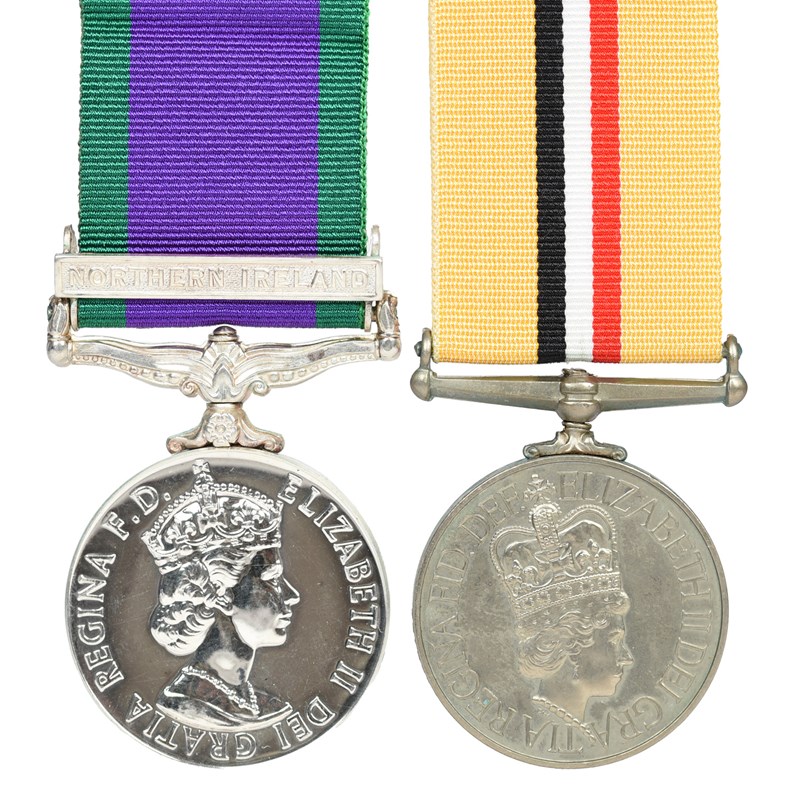 Two medals to Private T. F. McCann, Princess of Wales Royal Regiment: Campaign Service Medal 1962-2007, clasp: Northern Ireland (25177050 PTE T F MCCANN RWRR); Iraq Medal 2004, no clasp (25177050 PTE T F MCCANN RWRR), good very fine or better. [2]
