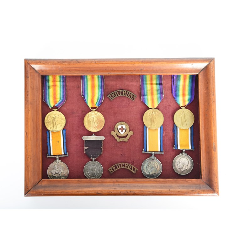 A small collection of Great War medals to Voluntary Aid Detachment nurses, comprising: three pairs, British War Medal and Victory Medal (M. M. ROBINSON V.A.D.), (I. SMITH V.A.D.), (E. HARRISON V.A.D.); a single Victory Medal (M. A. F. MACRAE V.A.D.); A Durham V.A.D. Worker tribute medal (687 S. B. BRIGGS), all very fine or better; together with a Red Cross hat badge and a pair of Red Cross shoulder titles. [11]