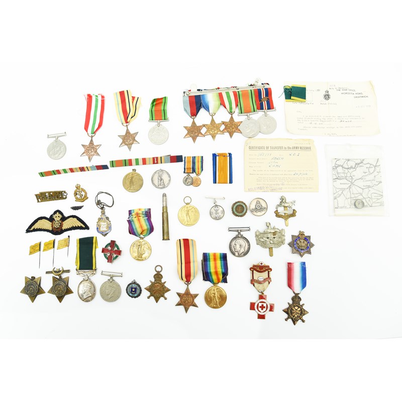 A quantity of British campaign medals, insignia, and associated items, including: two Khedive's Stars, 1882 obverse, one lacking suspension bar; a 1914015 Star (Q.M. & LIEUT: W. J. EMBERSON. R.A.); British War Medal 1914-20 (203688 PTE. N. WILLIAMS. WELSH R.); four Victory Medals (3360 PTE. F. G. SARGEANT, E. SURR. R.), (L. 4508 F. C. MITCHELL. O. C. 2. R.N.), (37535 PTE. G. A. FRAMPTON. GLOUC.), (-erased-); an Efficiency Medal (Territorial), George VI Fid. Def. (LT. K. JENNINGS R.A.), with accompanying form; various Second World War campaign medals, and other items.