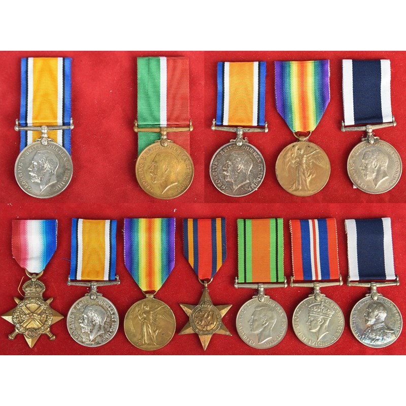 Three medal group to seafaring recipients: i) three to Walter Ernest Sibley, Royal Navy: British War Medal 1914-20 and Victory Medal (J.72885 W. E. SIBLEY. BOY. 1. R.N.); Royal Navy Long Service and Good Conduct Medal, George V (J. 72885W. E. SIBLEY. A.B. H.M.S. DOUGLAS.), display mounted, LSGC with edge bruising. otherwise very fine, (3); ii) two to Thomas William Penny, Merchant Navy: British War Medal 1914-20 and Merchantile Marine War Medal (THOMAS W. PENNEY), display mounted, good very fine, (2); iii) seven named or attributed to Chief Petty Officer Francis Charles Dean, Royal Navy: 1914-15 Star (J. 24006 F. C. DEAN. A.B. R.N.), BritIsh War Medal 1914-20 and Victory Medal (J. 24006 F. C. DEAN. A.B. R.N.), 1939-45 Star, Defence Medal, War Medal 1939-45, George V Royal Navy Long Service and Good Conduct Medal (J 24006 F. C. DEAN. L. S. H.M.S. VICTORY.), first three heavily rubbed, 1939-45 Star with unusual pitting, LSGC worn and with edge bruising; the last group accompanied by the recipient's Certificate of Service and other original documentation. [12]