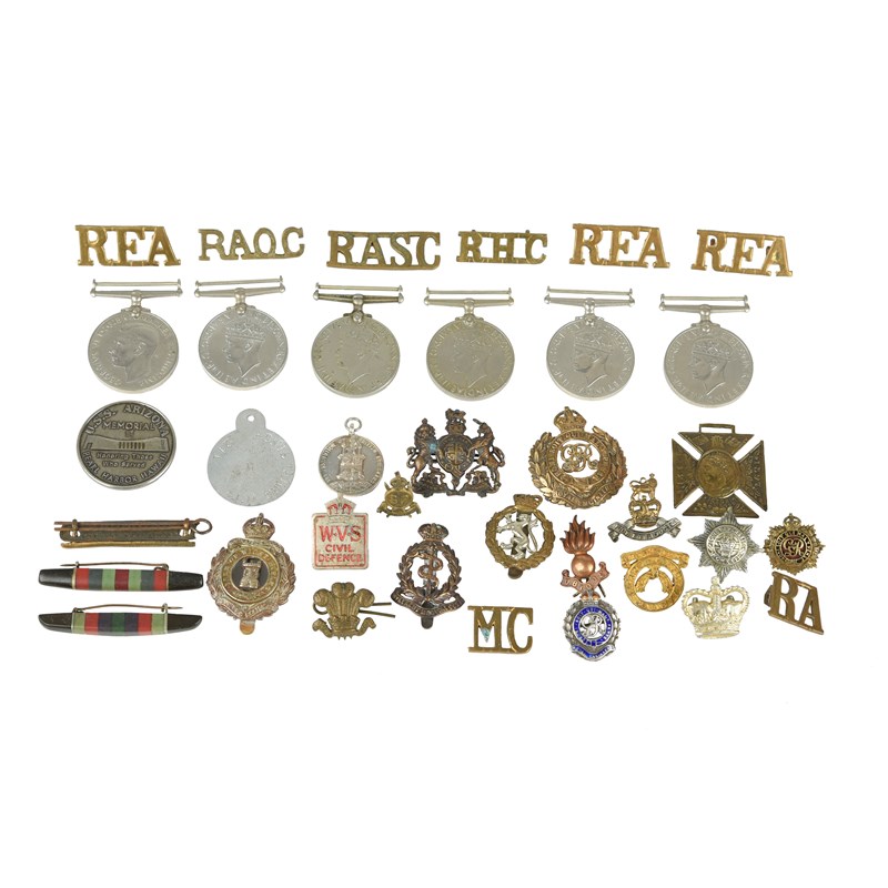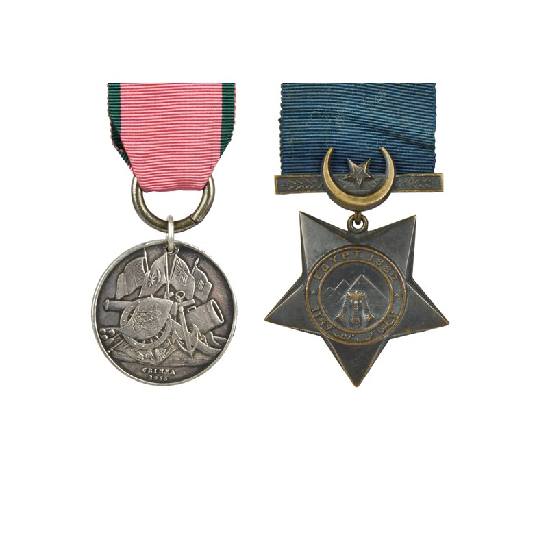 A Turkish Crimea Medal, Sardinian type, privately impressed (7694. J. MURDEN. 3. BN. G. GDS.)*, replacement foliate suspension, fine; together with another, British type, unnamed as issued, good fine; and a Khedive's Star 1882, unnamed as issued, good very fine; also with a small quantity of mainly British medals and insignia, including: 1939-45 War Medals (5), a Defence Medal, a W.V.S. Civil Defence lapel badge, a pair of RFA shoulder titles, various cap badges, and other items. [qty]