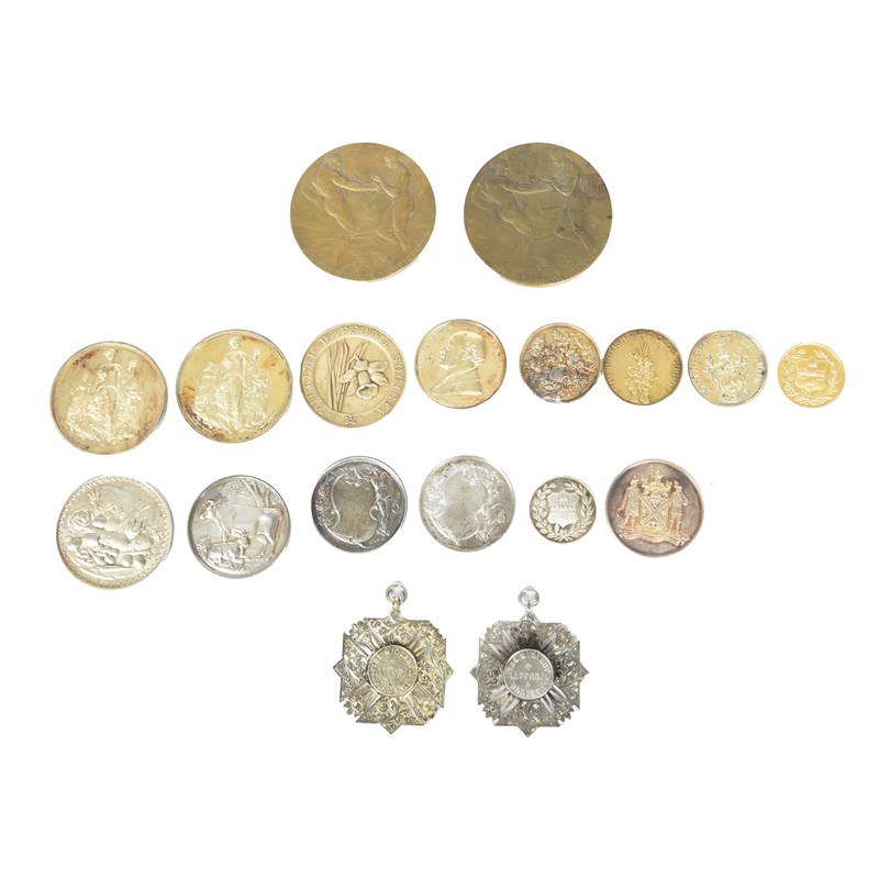 Sutton Seeds: a collection of agricultural and horticultural prize medals awarded to the famous Reading seed company, including: National Chrysanthemum Society, ''Collection of Vegetables...Nov. 12. 1889", gilt, 39 mm; Deeping St Nicholas District Agricultural Society, "1895...Prize Winner Mangel", silver, 54 mm, cased; The Grand Yorkshire Gala, 1895, gilt, 32 mm; the same, undated, "for a collection of vegetables", silver, 32 mm; The British Dairy Farmers' Association, "Awarded to Martin J. Sutton, for Red Polled Bull "Bockmer King", Dairy Show 1906", silver, 48 mm, edge impressed with award details, cased; Norfolk and Northwick Horticultural Society, 1907, silver, 45 mm, Birmingham hallmark; The Midland Daffodil Society (2), "Display of Cinerarias",1910 and 1911, silver, elaborate cruciforms with suspension loops, 55 mm; Midland Daffodil Society, "Flowers and Vegetables", 1913, silver, 51 mm; Aberdeen Show, "For Sweet Peas", 1935, silver, 44 mm, cased; and various others including unnamed specimens of he Royal Horticultural Society's medals and continental bronze examples, mainly high grades, award details engraved unless otherwse stated. [qty]