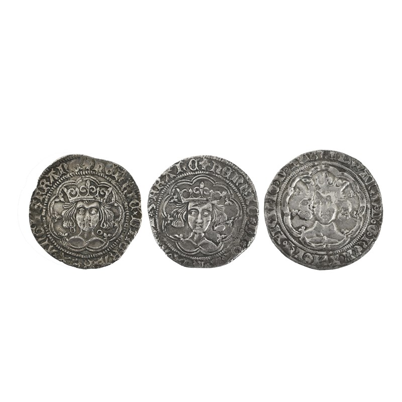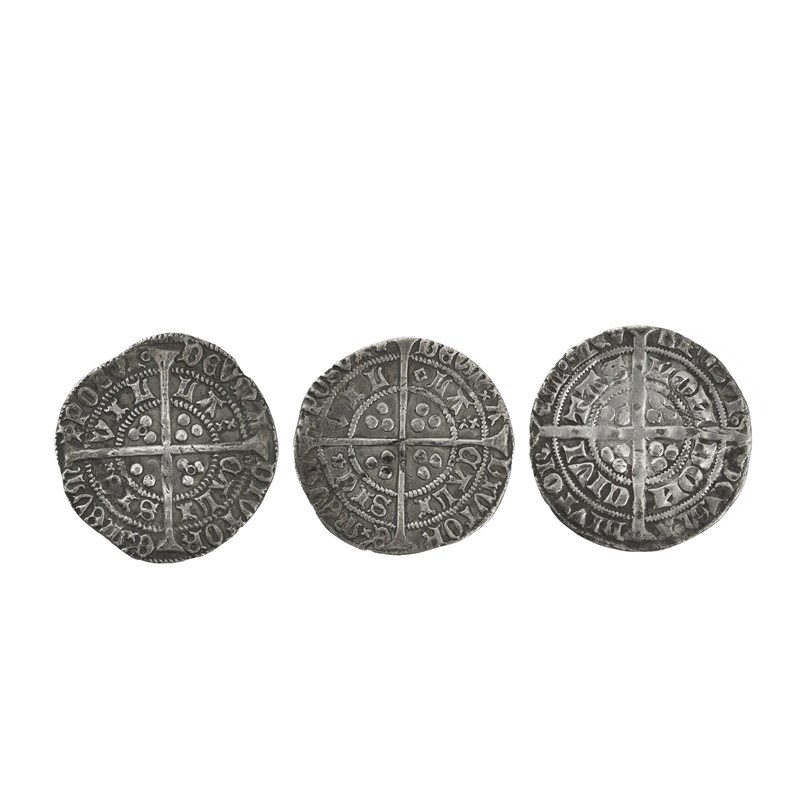 Henry VI, silver groat, annulet issue (1422-30), Calais (S 1836); and another, rosette mascle issue (1430-31), Calais (S 1859), each with some clipping, otherwise very fine; together with: Edward IV, second reign (1471-83), silver groat, trefoils on cusps (S 2096), clipped and worn, fine. [3]