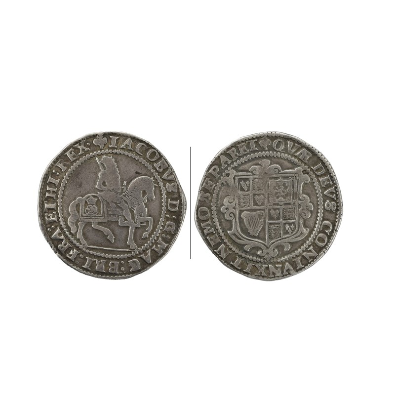 James I, silver half crown, third coinage (1619-25), equestrian portrait of the king right, plain