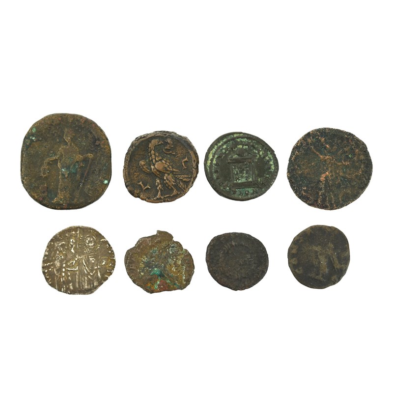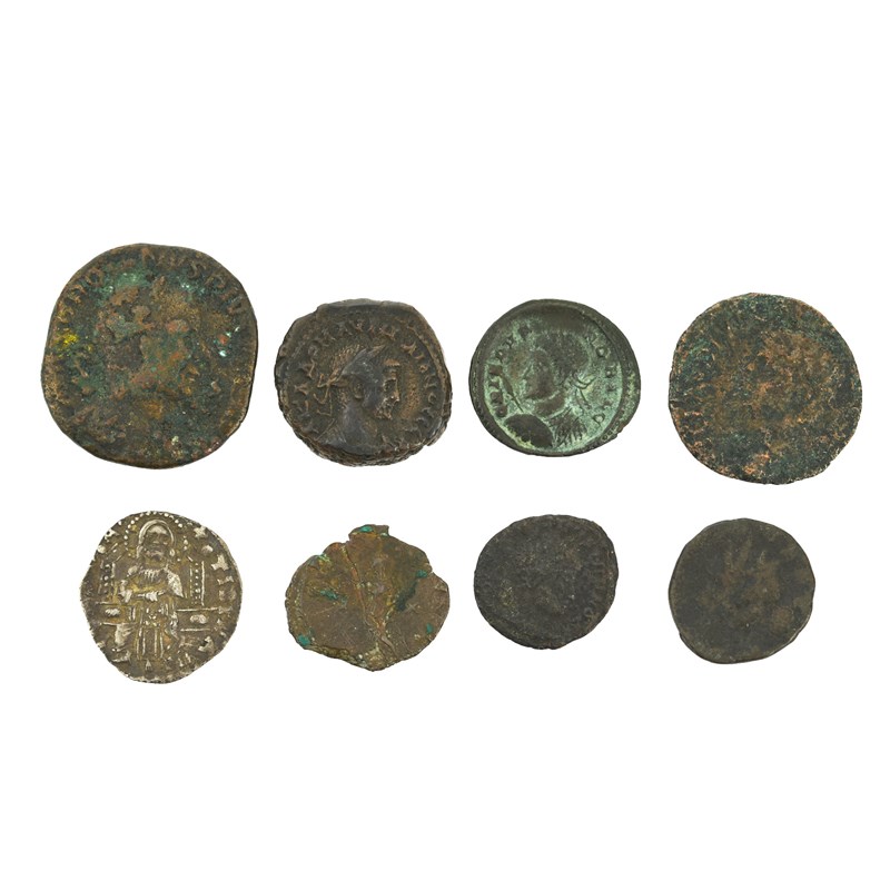 A small quantity of ancient coins, including: Rome - Empire, Crispus (317-326), AE4, bust left with shield and spear, rev. an altar with VOTIS XX in three lines, 2.69 g, very fine or better; Roman provincial coinage - Egypt, Aurelian, tetradrachm, year 2 (272/3), Alexandria, bust right, rev. eagle with wreath in its beak, 10 g, good fine; a Byzantine silver coin, legend unclear; and other items. [8]