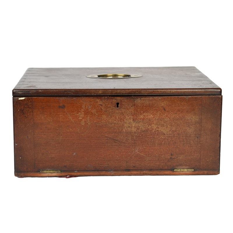A mahogany coin collector's cabinet, enclosing five drawers with partitioned sections in differing sizes behind a fall, the tops with a flush folding brass bale handle.