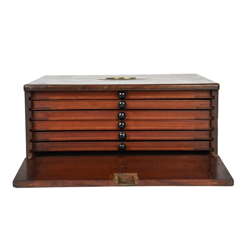 A mahogany coin collector's cabinet, enclosing five drawers with partitioned sections in differing