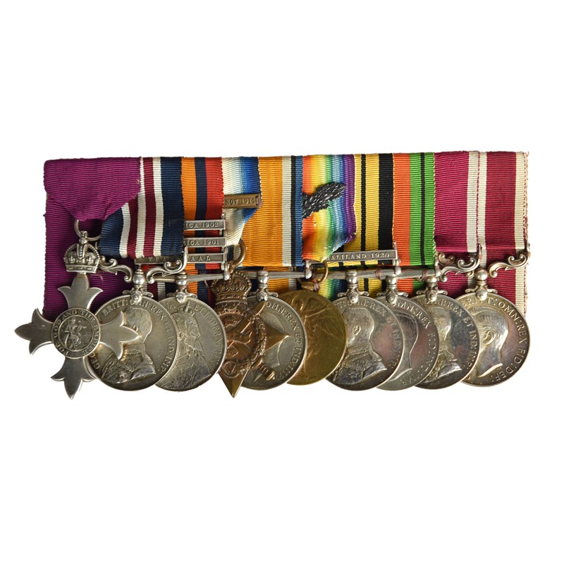 The M.B.E., M.M. and M.S.M. group of ten to Sergeant Albert Edward Gardner, East Surrey Regiment and Hampshire Regiment: The Most Excellent Order of the British Empire, Civil Division, Member's breast badge (M.B.E.), Garrard, London 1933; Military Medal, George V (19857 SJT A. E. GARDNER. 4/HANTS: R.); Queen's South Africa Medal, second type, 3 clasps: Transvaal, South Africa 1901, South Africa 1902 (6409 PTE A. GARDNER. E. SURREY REGT); 1914 Star with tailor's copy clasp (L-6409 L. SGT A. E. GARDNER 1/E. SURR: R.); British War Medal 1914-20 and Victory Medal with M.I.D. emblem (6409 SJT. A. E. GARDNER. E. SURR. R.); Africa General Service Medal 1899-1956, George V, clasp: Somaliland 1920 (L-13952 W.O. CL. 11. A. E. GARDNER. E. SURR. R.); Defence Medal, unnamed as issued; Army Long Service and Good Conduct Medal, George V (6134101 SJT. A. E. GARDNER M.M. E. SURR. R.); Meritorious Service Medal, George VI, Fid. Def. (6134101 SJT. A. GARDNER. (M.M.). SURREYS.); mounted for wearing, very fine and better, the MSM with official alteration to the service number, [10]; together with this man's Certificate of Service (Form B 108), and other contemporary documents.