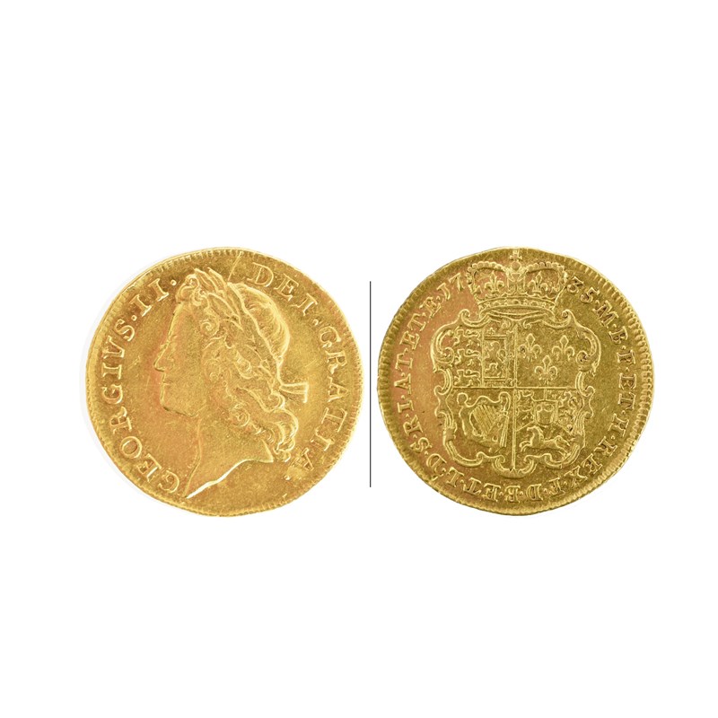 George II, gold guinea, 1735, second young laureate head, larger lettering, rev. shield of arms (S 3674), good fine or better.