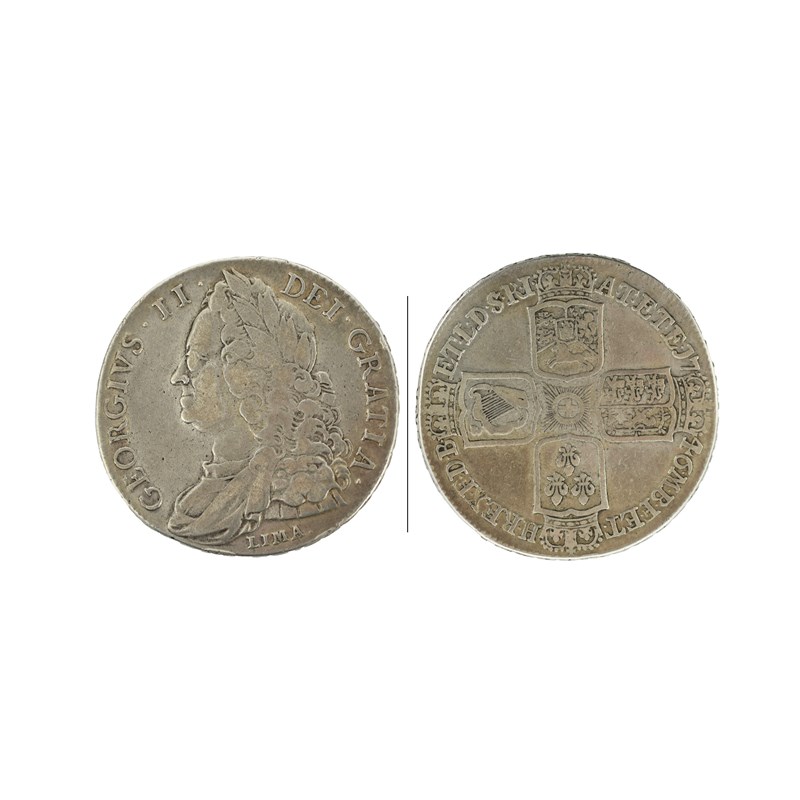 George II, silver crown, 1746, old bust, LIMA below, rev. plain angles, edge DECIMO NONO (S 3689), good fine.