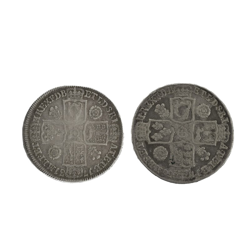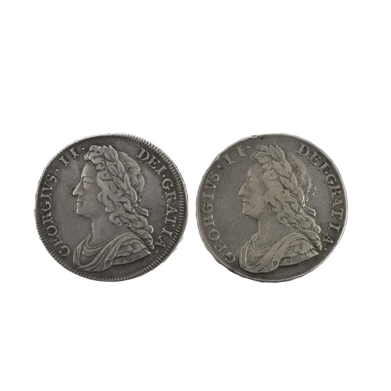 George II, silver halfcrowns (2), 1731, young bust, rev. roses and plumes, edge QVINTO, good fine or better; 1736, edge NONO, fine or a little better (S 3692). [2]