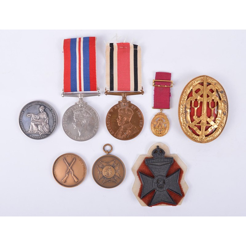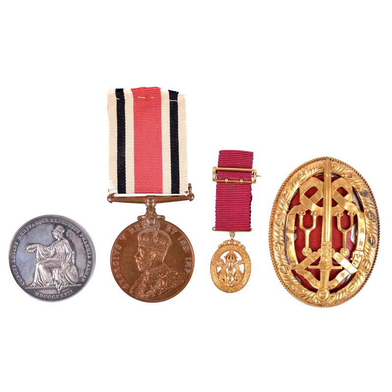 A collection of of insignia and medals, comprising: a Knight Batchelor's badge, silver gilt and enamel, maker's mark 'R.J.', London 1935, damage and loss to enamel, otherwise good very fine or better; the Order of the Bath, miniature badge (civil), with ribbon and buckle brooch, extremely fine; a Special Constabulary Long Service Medal, George V (WILLIAM MARTINEAU), extremely fine; University College London, a silver 3rd prize medal to G. Martineau for Chemistry 1852-3, nearly extremely fine; two 20th Century shooting prizes; a British War Medal 1939-45; and a K.R.R.C. cap badge. [8]
