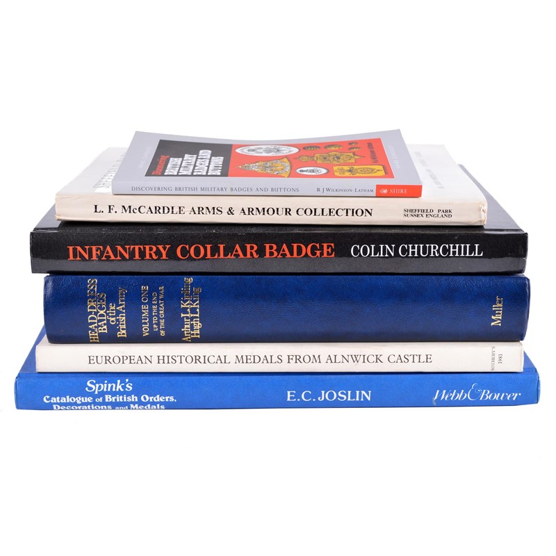 Kipling and King, 'Head-Dress Badges of the British Army', volume one, hardcover; Colin Churchill, 'History of the British Army Infantry Collar Badge', hardcover; and four other works of reference. [6]