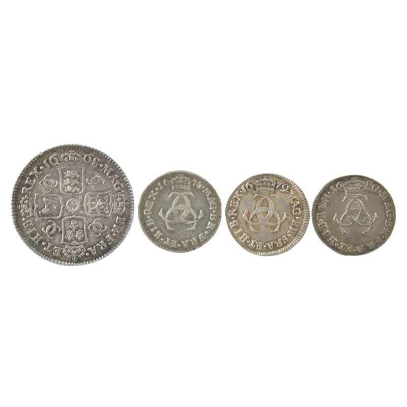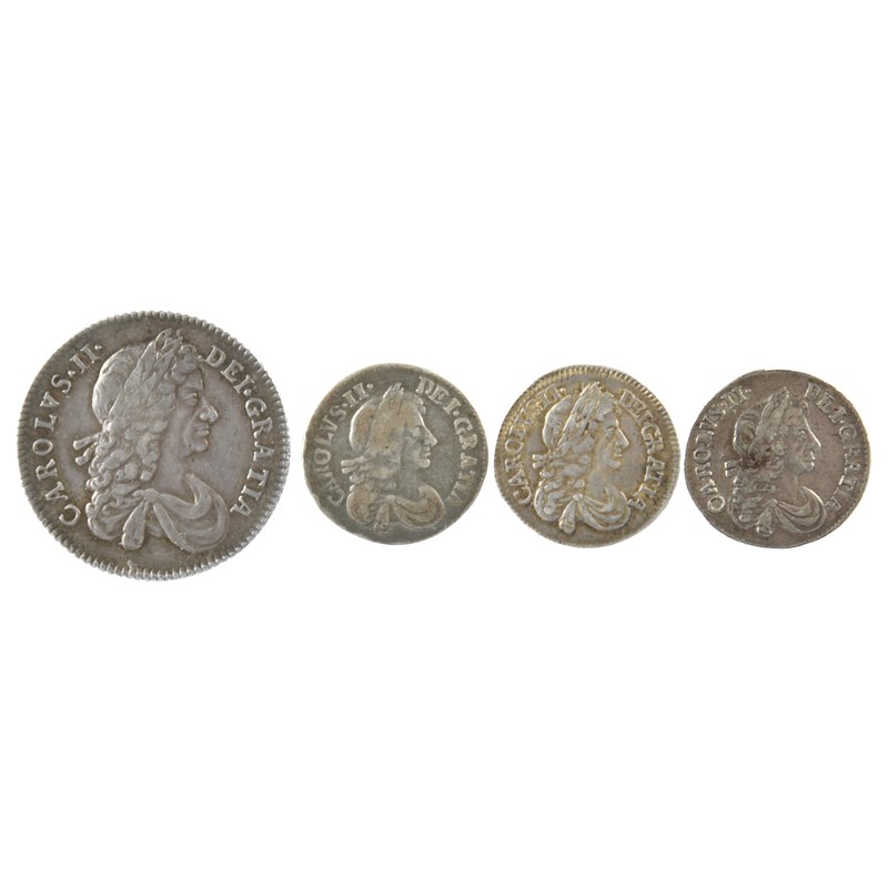 Charles II, silver coins (4): shilling, 1668, second bust (S 3375), good very fine with some lustre; threepence, 1676 (S 3386), fine; threepence, 1679 (S 3386), clash marks to obverse, very fine; threepence, 1680 (S 3386), near very fine. [4]