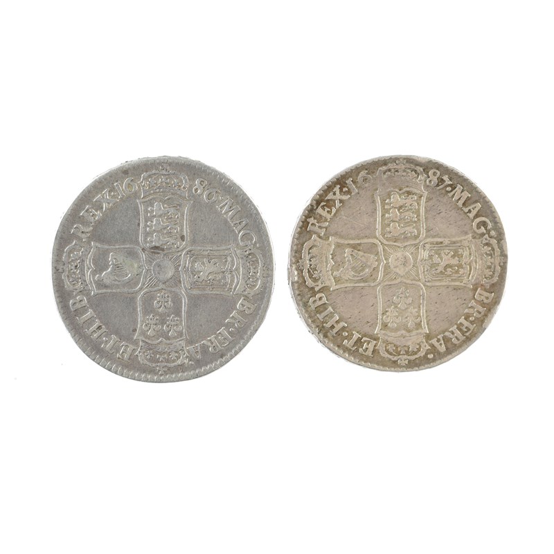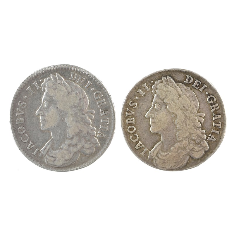 James II, silver half crowns (2): 1686, first bust, edge SECUNDO; 1687, edge TERTIO (S 3408), each at least good fine. [2]