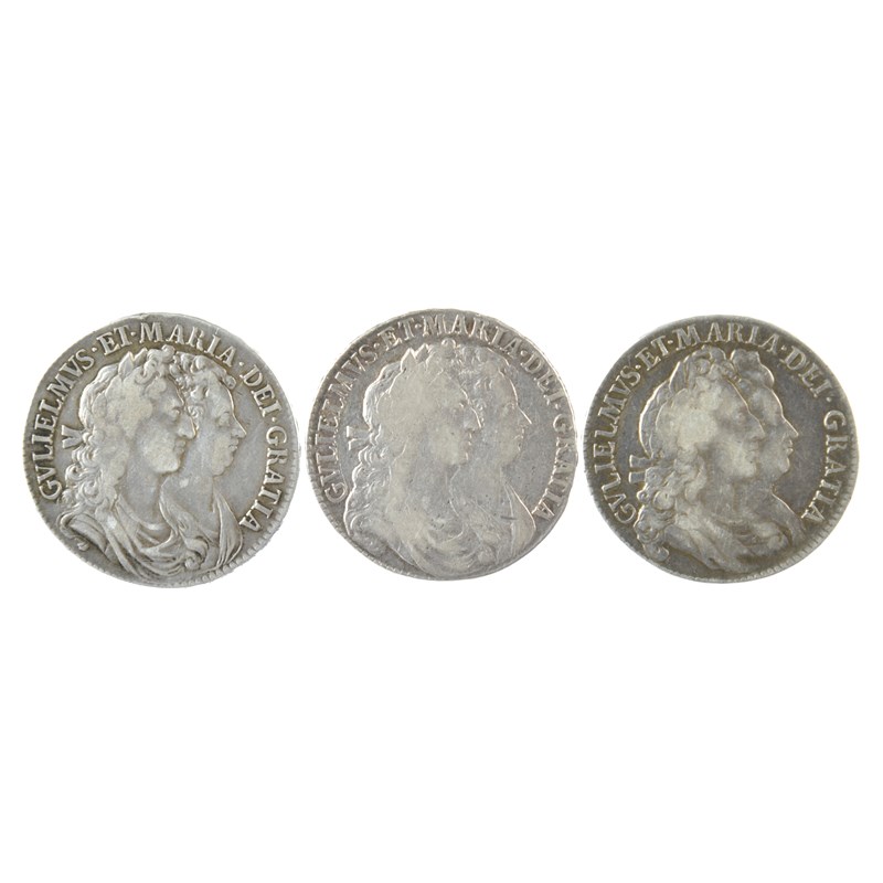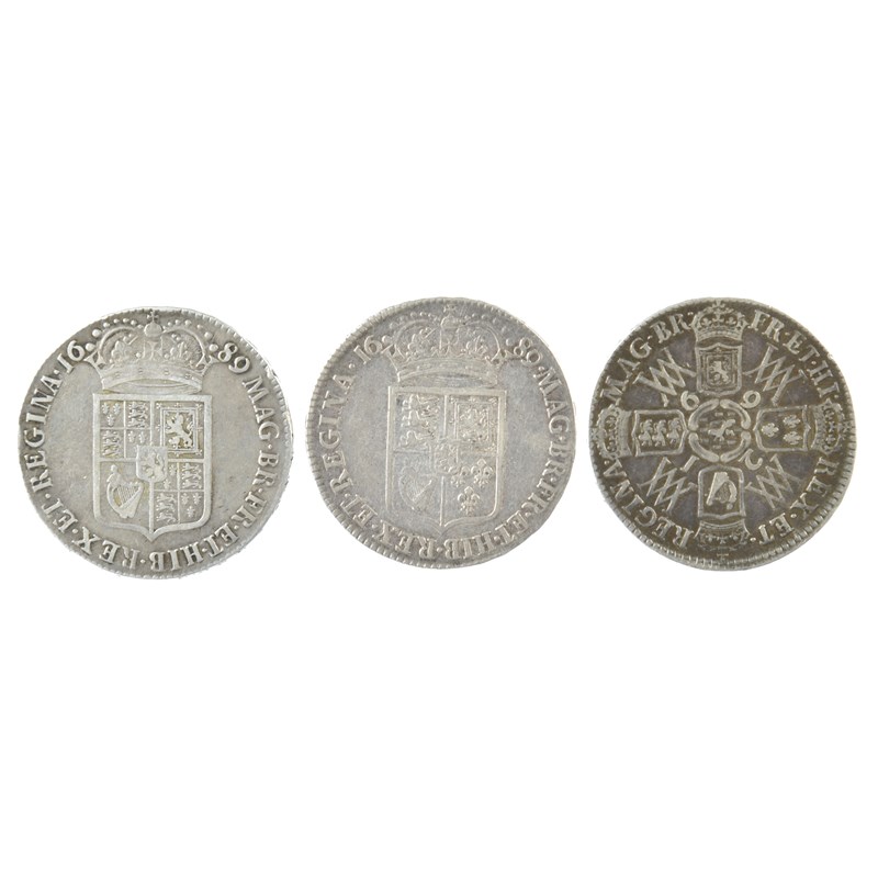 William and Mary, silver halfcrowns (3): 1689 (2), first conjoined busts (S 3434), one very fine or nearly so, the other good fine, reverse better; 1692, second busts, edge QVARTO (S 3436), near very fine, reverse better. [3]
