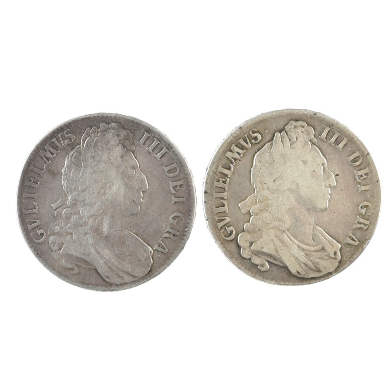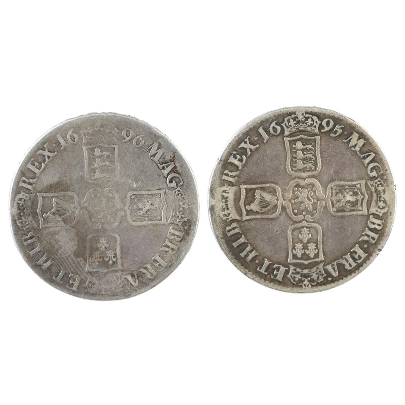 William III, silver crowns (2): 1695, edge SEPTIMO (S 3470), fine; 1696, edge OCTAVO (S 3470), good fine. [2]