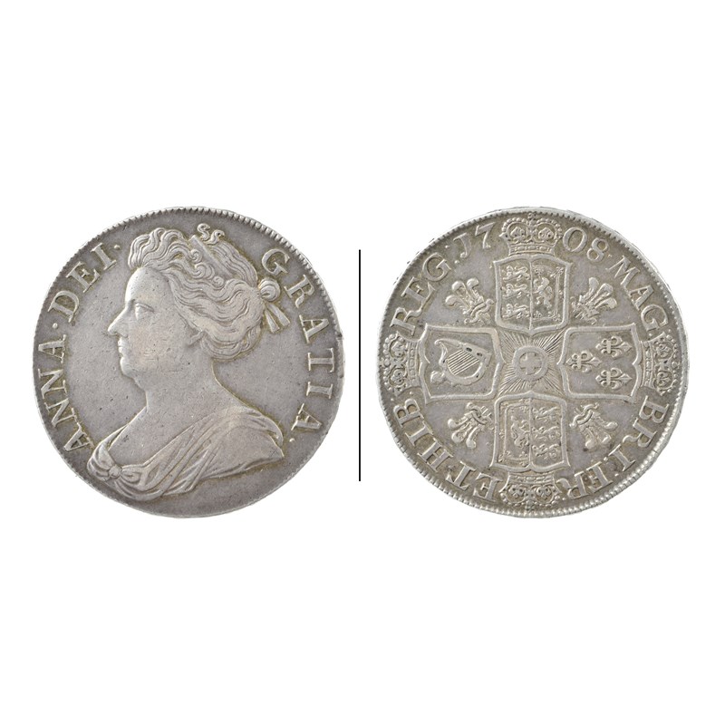 Anne, silver crown, 1708, second bust, rev. plumes in angles, edge SEPTIMO (S 3602), very fine, reverse much better, toned.