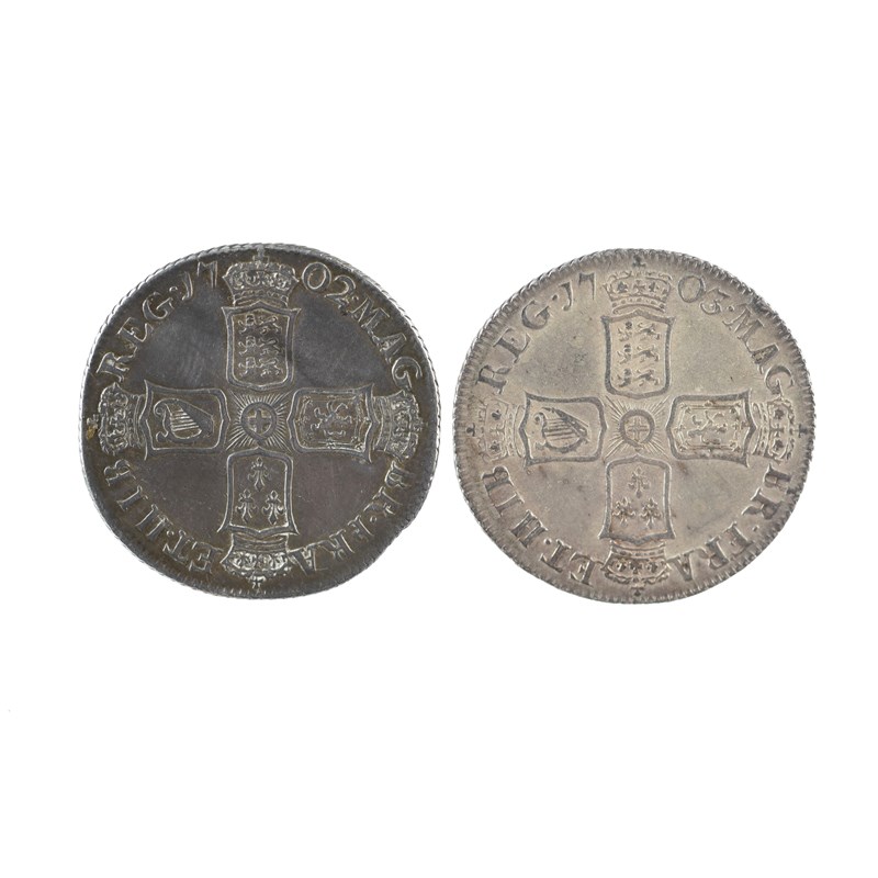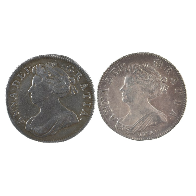 Anne, silver shillings (2): 1702, first bust, rev. plain angles (S 3583), good fin or better and toned; 1703, second bust, VIGO (S 3586), about very fine. [2]