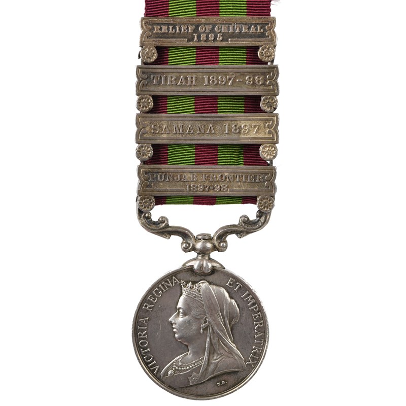 An India Medal 1895-1902 to a Sapper of the (Queen's Own) Madras Sappers and Miners, 4 clasps: Punjab Frontier 1897-98, Samana 1897, Tirah 1897-98, Relief of Chitra 1895 (508 Sapper [name unclear] No 4 Coy Q.O. Madras S&M), very fine.