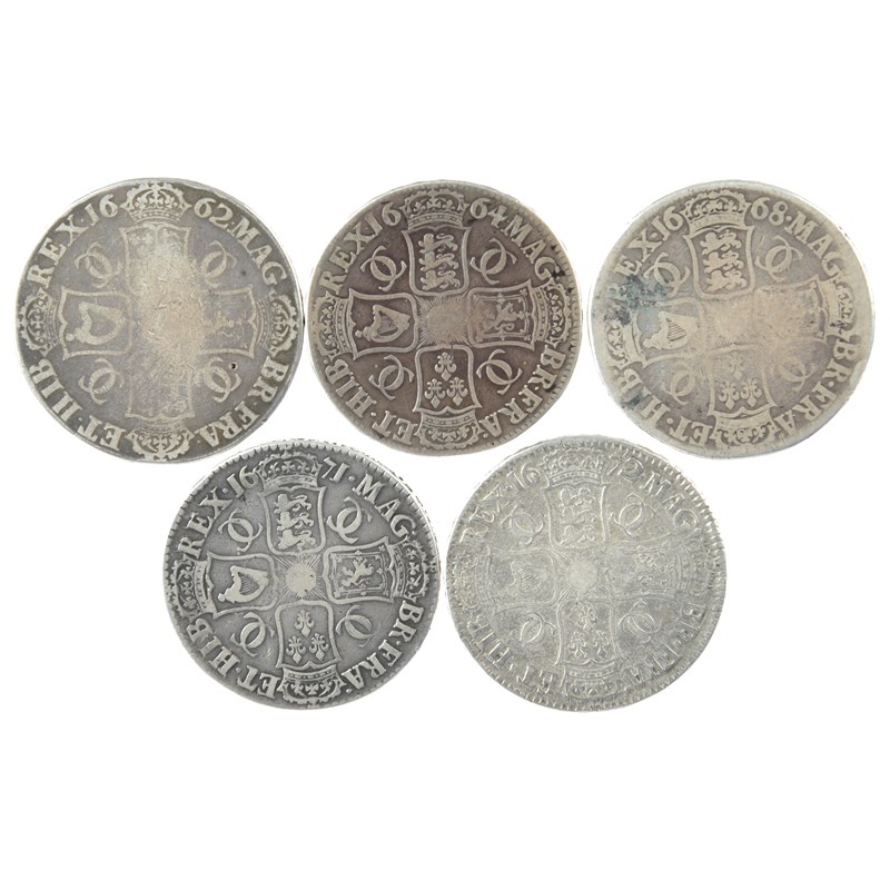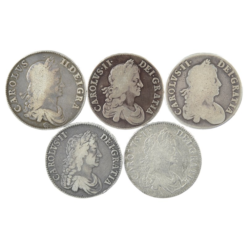 Charles II, silver crowns (5): 1662, first bust with rose below, undated edge (S 3350), fair to fine; 1664, second bust, edge XVI (S 3355), near fine, reverse better; 1668 (S 3357), good fair; 1671, third bust, edge V. TERTIO (S 3358), good fine; 1672 (S 3358), fine. [5]